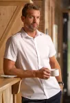 Ανδρικό πουκάμισο με λεπτή φόρμα με κοντά μανίκια και στρίφωμα σε σχήμα κάτω. Περισσότερο